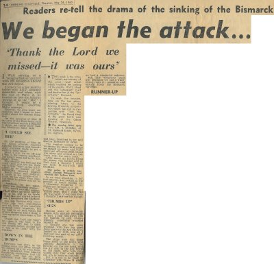 RUNNER-UP This letter came from Mr. A. L. Robson (ex-Petty Officer R.N.), 25, Athol Gardens, West Monkseaton. He writes: Wednesday afternoon at Scapa Flow always found a soccer match, a drink in the naval canteen, a sly game of crown and anchor, a sing-song, and back on board by 6.30 p.m. On board H.M.S. Hood, lying at anchorage, activity was not hard to see. She was preparing for sea. Later in the evening [21 May] she sailed on what proved to be her last and most tragic trip. I was a member of the crew of H.M.S. King George V. We sailed the following day [22 May] in company with H.M.S. Victorious and destroyer escorts. Not until we were at sea and working up to a steady 20 knots, were we told that Bismarck, with a cruiser believed to be Prince Eugen, were attempting a break out into the North Atlantic. By now Hood and Prince of Wales had joined forces. The hunt was on. Friday [23 May] found H.M.S. Repulse, (another old ship of mine as was H.M.S. Hood), now in company with K.G.V., Victorious and escort, steaming steadily N.W., towards the Denmark Strait. A broadcast over the ship's Tannoy system informed us that Norfolk and Suffolk had made a radar contact with what was presumed an enemy force and were shadowing. Bismarck and Prinz Eugen tried desperately to shake the shadowing cruisers off but grimly they hung on to their task until heavy units of the R.N. closed, bearing in mind great distances were separating our forces. We slowly drew to a close, we on board K.G.V. were kept right up to date with whatever information could be passed over the Tannoy system by Captain Patterson. HOOD HAD BEEN SUNK Saturday approached (all naval personnel will remember dawn and dusk action stations). We closed up as usual, but on falling out from action stations, rumours were ripe, "buzz's" as the sailors called them. The buzz we were hearing was that Hood had been sunk, Prince of Wales damaged and our fears were confirmed later when we were told officially by the captain. Not only had Bismarck struck a major blow to the Royal Navy, but what was most disturbing was the fact she had given us the slip. She must be found. Oil supplies in the capital ships were now rapidly decreasing. The shock of losing the Hood was a great blow. After all, wasn't the Hood "unsinkable"? She was a great ship - I know I served on her during the first months of the war. Sunday [25 May] passed uneventfully. Monday dawned. Force H, Renown, Ark Royal and Sheffield had joined the hunt. FORCES GATHERED North, east, south and west, forces gathered. Captains of battleships, battle cruisers, carriers, and cruisers, and destroyers must have had only one thought: "SINK THE BISMARCK." By now an extensive search was going on, a Catalina aircraft piloted by a North-East pilot (I believe he was from Whitley Bay) spotted Bismarck. Signals flashed, the search had changed once again to the chase. Ark Royal, ready with torpedo aircraft, made an attack. Two hits were believed to have been scored. Evening approached and as gathered destroyers prepared to make a night torpedo attack, the destroyers though pressed very hard, made a successful attack, and a hit, I believe, damaged her steering gear. WEATHER WORSENS Dawn breaks on Tuesday morning [27 May] ... The weather is deteriorating. K.G.V. has joined up with H.M.S. Rodney. (Repulse has had to leave because of shortage of oil.) Bismarck, now 400 miles from Brest alters course towards K.G.V. and Rodney, not of choice, but of fate. Her damaged steering gear gives her no other option. For the first time guns bear on Bismarck. K.G.V. and Rodney open up at extreme range, naval traditon is borne out again: "Close the range." Hits are scored, Bismarck replies, near misses are registered. Bismarck is now being repeatedly hit. Her flag still proudly flies at her mast head, now she is silent and listing. "FINISH HER"