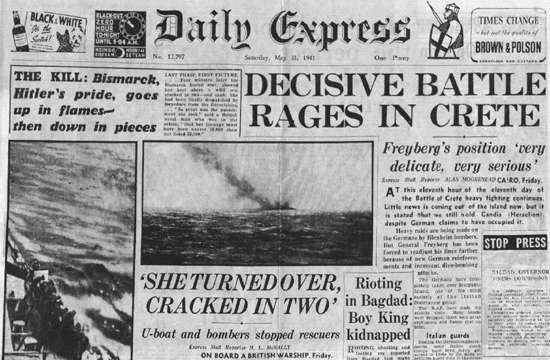 Front page of the Daily Express No. 12,797 of May 31, 1941. The main article continues on back page.