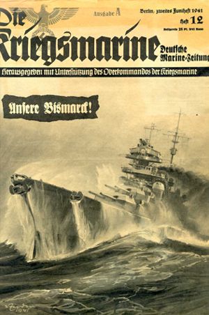 The battleship "Bismarck's" actions have proven her superiority over every ship (of its) type presently known. Moreover, any other vessel in the German Navy will also show the world the fact that [our] ships and crews are united, and that each and every ship embodies a maximum of fighting power for its type. The battle continues - for day and night German units furrow through the oceans to threaten enemy sea-lanes and to sink any (enemy) ships that appear in their sights. Germany fights until the enemy is cut down!