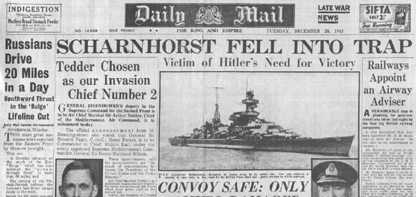 "Several days ago an enemy convoy bound for Murmansk had been observed by German reconnaissance aircraft. This convoy carried war equipment and food supplies for the Russian front. A task force of the German Navy was therefore sent against it, and off the North Cape the enemy convoy was intercepted. Poor weather allowed only limited visibility. On December 26 towards 11 a.m. the battle-cruiser Scharnhorst with the commander of destroyers, Konter-Admiral (Rear Admiral) Bey, as C.-in-C. of the task force on board, established fighting contact with escort units consisting of destroyers and cruisers protecting the convoy. Shortly after the engagement had begun one of the enemy heavy units intervened in the battle. In the course of the engagement the enemy succeeded by a surprise move which, owing to the prevailing poor visibility, could not at first be discerned, in bringing up heavy units. After several hours of the fiercest action the Scharnhorst, under the command of Capt. Hintze, was encircled by enemy units. She sank with her colours flying towards 7.30 p.m., after having inflicted heavy damage upon the enemy. The remaining German units participating in the battle suffered no loss." MISCALCULATED The Scharnhorst had been lying in Alten Fiord with the damaged Tirpitz for nearly two years. That she should have gone out alone is a clear indication that the Germans are in desperate need of a propaganda victory in the fleet. Morale has been steadily declining, so that last September a spectacular "raid" had to be made on Spitzbergen, defended by 100 Norwegians, mostly meteorologists. Scharhorst, Tirpitz, and Lützow with a destroyer screen, undertook this "daring exploit." The sunk warship had nine 11in. guns and a speed of 32 knots. No ship of 11in. guns could have answered the 14in. guns o a ship of the King George V class, which was probably Admiral Sir Bruce Fraser's flagships, without taking great punishment. The small pinpoints of fire, glowing as the Arctic twilight faded into night, must have been the forerunners of great flames ravaging the German warship from stem to stern [At this point the article continues on page 4, Col. 1 under the title: "Sunk in Navy's Trap"]