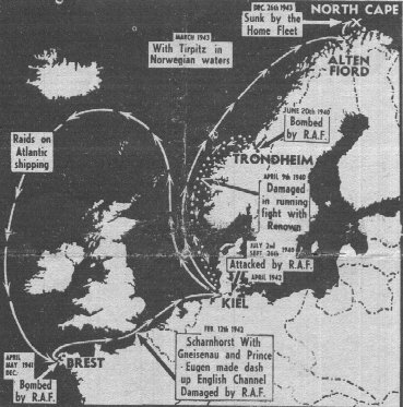 and making her a target that stood out in the darkness. The Scharnhorst probably died with a final explosion of her main magazines, by which she was riven out of all semblance of a ship. If she could have profited by the Arctic nigh to get in among our Russian convoy she might well have done considerable havoc and got clear away. Only our fastest ships could have pursued her, and in doing so she probably calculated that one or more might lay herself open to a lucky torpedo attack from her screening destroyers. But she apparently fell into her own trap and Admiral Sir Bruce Fraser, known for his aggressive tactics, found an occasion worthy of his metal. Three times already he has taken out his ships to "trail their coats" round Alten Fiord. At last his perseverance has had its reward. The question is: Why did the Scharnhorst, with her speed, stay to match herself against the giants of the Home Fleet? The answer is that she must have been crippled and unable to fly. These were the tactics which led to the end of the Bismarck. Our now historic tactics of massed torpedo attacks by destroyers probably got home some good shots. One recalls how the Norfolk and Suffolk dogged the Bismarck in the Denmark Strait. It may well be that cruisers of this type -or even one of these well-tested veterans- skirmishing wide of the main body of the convoy and its escorting units, flashed back the original signal of a German capital ship at sea -the first sight of one, in fact, since that memorable day nearly two years ago when the Bismarck was pinpointed on the chart. In the circumstance one may expect survivors. German ships are over-manned by our standards, and her complement if probably 1,200. Out of such a number a score or more might easily have dodged death both in the ship and in the icy waters to which the flames drove them. With the Tirpitz and Gneisenau damaged, and the Bismarck and Scharnhorst sunk, the only German heavy units capable of action are two 10,000-tons pocket battleships, the Lützow -formerly the Deutschland- and the Admiral Scheer, both of which are in the Baltic. MOSCOW PRAISE MOSCOW radio, praising the "splendid British Navy," last night hailed the Scharnhorst sinking as a "nice Christmas present for the Allies and another portend of dismay for the German people." Russian provincial papers will today prominently feature the full text of the British Admiralty's communiqué. Washington naval observers believe that the loss of the battleship may force the German battle fleet back to its hide-outs for the duration. The German people were told of the loss in the first morning broadcast of German radio yesterday.