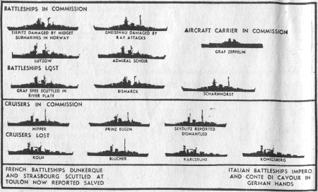 His heaviest units are the two 8-in. cruisers Hipper -now at Trondheim- and Prinz Eugen damaged at Kiel.