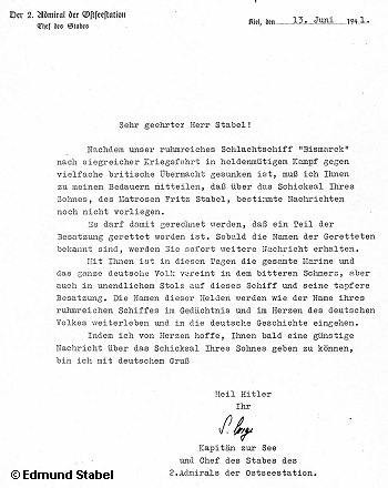 In view of the fact that our illustrious Battleship "Bismarck" has sunk after a victorious combat mission that was marked by a heroic fight against a multiply superior British force, I must inform you with my deep regrets, that definitive reports about the fate of your son, Matrose Fritz Stabel, are not yet available.