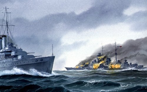 It depicts the Prinz Eugen and the Bismarck opening fire on Vice Admiral Holland's force during the Battle of the Denmark Strait on 24 May 1941.