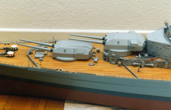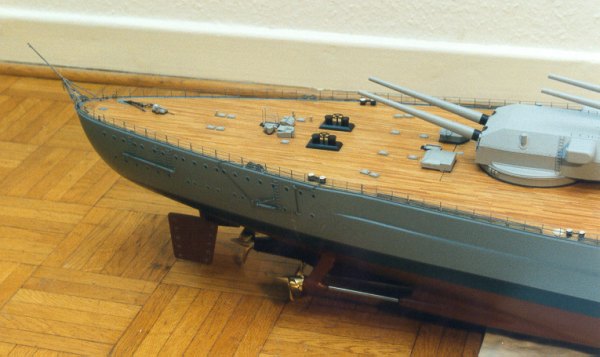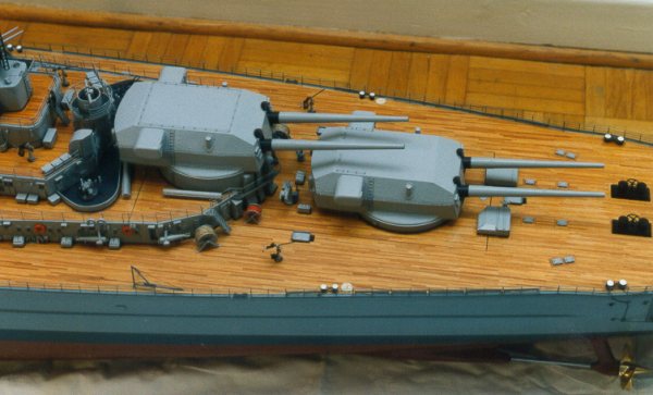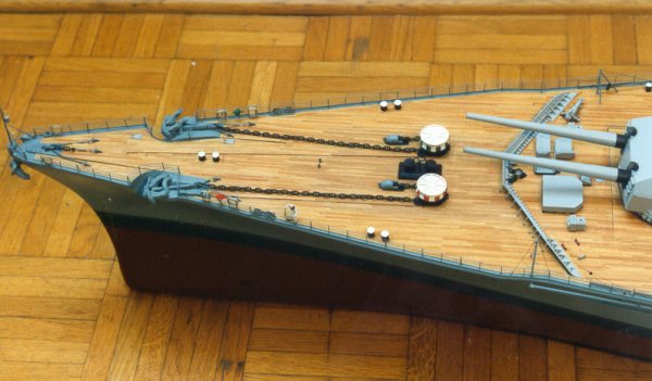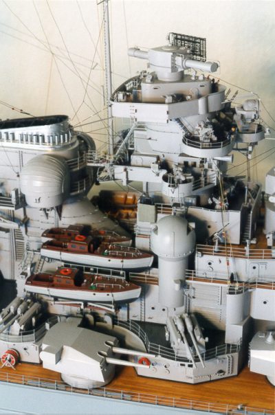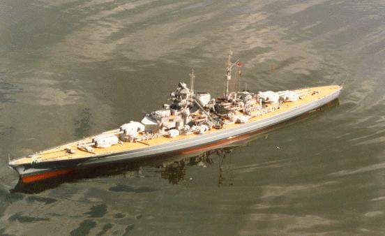 This 1/100 Bismarck model is in exact scale. It is 2,510 mm in length, 360 mm in width, and has a maximum weight in water of 51 kilograms. The upper deck is 0.5 mm cherry wood and has more than 9,000 planks, each 1.2 mm in width. The thickness of the main armour plates is in scale, too, and, therefore, the front armour of the main battery turrets is 3.6 mm thick. The propulsion plant consists of three Audi electric motors for heating a car, that, together with six 12V batteries, allow the ship to sail for a whole day. The radio controlled functions include: