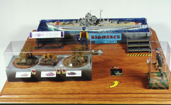 The battleship is part of a small museum together with other models of German WWII tanks (Panther, Kingtiger and Jagdpanther) and two figures including a civilian spectator.